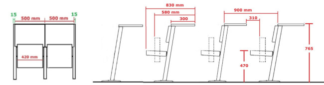 The AK-9016 has a foam upholstered seat and back with a hinged self-returning seat for ease of movement along the row. The frame is made from tubular powder coated steel and, the desk top is laminated for easy care. The middle rows are made up of a seat/desk combo. With the front row desk only and the back row seat only.