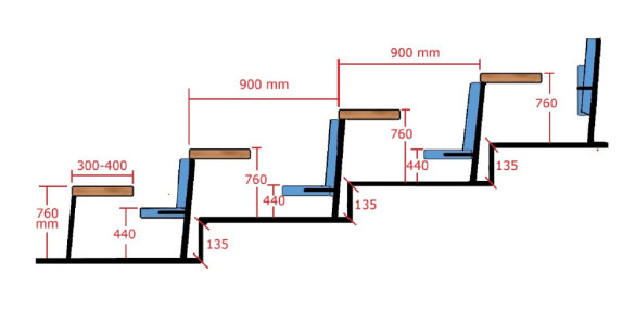 The AK-9016 has a foam upholstered seat and back with a hinged self-returning seat for ease of movement along the row. The frame is made from tubular powder coated steel and, the desk top is laminated for easy care. The middle rows are made up of a seat/desk combo. With the front row desk only and the back row seat only.